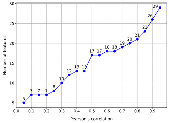 Initially, the algorithm receives as input parameters the dataset, instances of the tree-based algorithms, and the number of times the experiment must be repeated. In line 2, the work variables are initialized. In line 6, the main loop is controlled by the variable p, which is incremented from 0.05 to 0.95 in steps of 0.05. On line 8, the dataset is copied to a temporary variable. The following line calculates the Pearson correlation for all pairs of features in the dataset. In line 10, features with a Pearson correlation equal to or greater than the value of p are removed from the temporary dataset. Then, the reduced dataset is used to train classifiers, which will be evaluated from the perspective of the F1-Score metric in line 12. Finally, the data corresponding to the current iteration, the value of p, and the performance score of the classifiers are stored in , which serves as a data log for the entire process. All of the main loop steps are repeated according to the variable. After finishing all iterations, the program will show all data stored in the variable. The graph in Figure 6, built from data saved in , shows how the correlation used in the filter method influenced the dataset’s number of features. In the graph, it is possible to see that even for values of p above 0.9, there is a considerable reduction in the number of features.