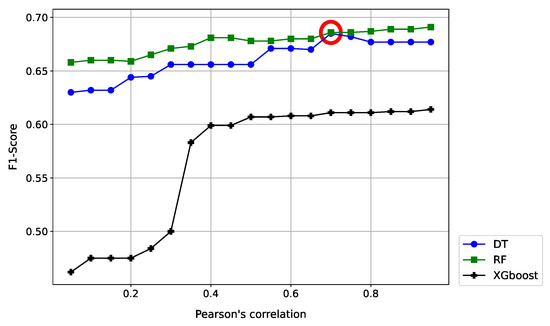 Feature selection can also remove noise and undesirable characteristics that lead to poor performance of the algorithm, minimizing the risk of overfitting, as shown in [42] where the authors evaluate different classification algorithms trained with different datasets and in [43] where the authors try to avoid overfitting the model by removing features based on Pearson’s correlation.