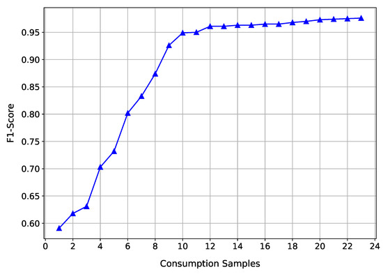 The performance of the model improves as the number of historical samples increases. The model reaches 93% concerning the F1-Score metric when the customer has at least nine consumption samples. However, if we consider the point where the model’s performance exceeds 80% for the F1-Score metric, we can say that the model trained with our approach can identify NTL in consumers with a minimum history equal to 7 months.