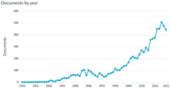 One of the most efficient and widely used types of compact heat exchangers in the industry is the plate heat exchanger (PHE). The construction and operation principles of PHEs are well-described in a number of books, including those dedicated to this type of heat exchanger (e.g., [4]). The total number of papers in the SCOPUS database with the words “plate heat exchanger” in the title and abstract published between the years 1956 and 2022 was 8112, with more than half (4245) in the last 10 years. As can be seen from the graph in Figure 1, the first increase in publications per year was after the energy crisis of the 1970s, and there has been huge growth in recent years. The number of papers published in 2020 was about 500, which was twice the number from 10 years ago. This shows the growing interest in research in this promising area. To analyse all this information is not easy. Review papers in the last decade included an analysis of advances in PHE at the time of publication [5], a review of heat transfer enhancement in PHEs [6] and an attempt to make such reviews more comprehensive [7]. With references in each of these reviews, including about 200 sources, many papers on PHEs remained out of their scope.
