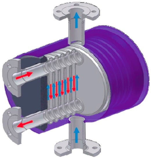 Another principle for the channel arrangement is used in plate-and-shell WPHEs [24], shown in Figure 5. The pack of round plates is encased in a round shell, allowing for an arrangement with a parallel flow of streams: a counter-current in one-pass or mixed-in multi-pass PHEs. Originally developed in 1990 at Vahterus Oy, with different modifications, it can work at pressures up to 150 bar and temperatures from −270 °C to 750 °C [25]. Now, WPHEs are manufactured with this principle by a number of other producers. As with all welded PHEs, they can have fatigue problems, which are investigated in, for example, [26].