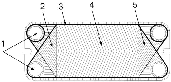 Schematic drawing of commercial PHE plate: 1—ports for stream flows in and out of the channel; 2 and 5—zones of flow distribution; 3—gasket; 4—the main corrugated field.