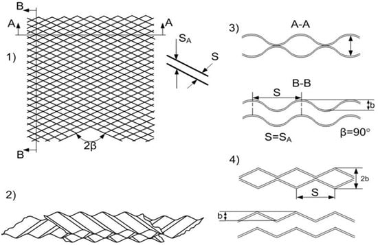 Schematic drawing of the main corrugated field channels: (1) corrugations crossing; (2) three-dimensional view; (3) sinusoid-shaped corrugations; (4) triangle-shaped corrugations.