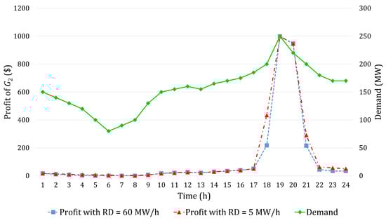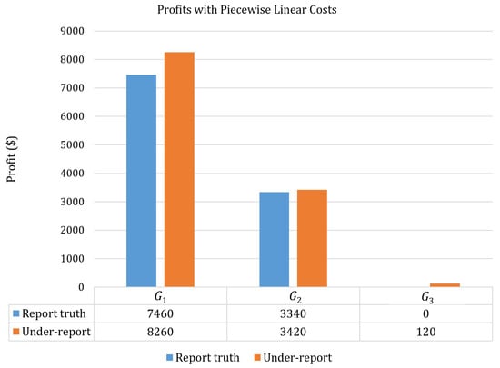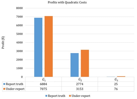 In this subsection, the quadratic cost functions presented in Table 1 are considered. Again, it is assumed that generators and report their true ramp-up and -down rates (the same), and reports their true ramp-up rate (25 MW/h). It is also assumed that may report its ramp-down rate as 25 MW/h (the true value) or 5 MW/h (a low value). The ED and PM problems are solved in the same way described above in Section 3.2. The ED problem is solved twice with the true and low values of the reported down-up rate of . For each scenario, the PM problem is solved with its true ramp rate given the corresponding TLMP for all intervals. Then, the same process is repeated for scenarios where or may not report their true ramp-down value. The results are presented in Table 3 and Figure 5 below. Similar to what is presented in Section 3.2, each generator makes a higher profit by revealing a lower ramp-down rate. This implies that revealing ramping rates truthfully may not be in the best interest of the generators when their costs are quadratic under the TLMP pricing scheme.