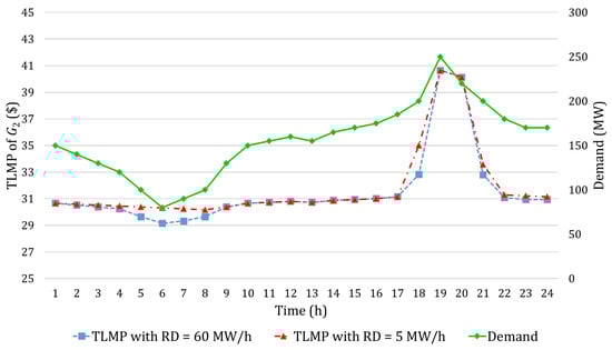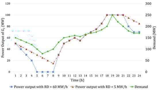 Figure 3 shows the power output of when the reported ramp-down rate is 60 MW/h and when it is 5 MW/h. With the true ramp-down rate, it can be seen that the power output of becomes 0 MW when demand is lower than 100 MW (intervals 5 to 8) and does not get paid. However, with the low reported ramp-down rate, the power output of decreases slowly from 30 MW to 15 MW and does not reach 0 MW. As seen in Figure 2, the TLMP values for these intervals are higher than the marginal cost of ($30 for the first block). Therefore, is paid between intervals 5 and 8. The above shows that can get paid more by under-reporting its ramp-down rate.