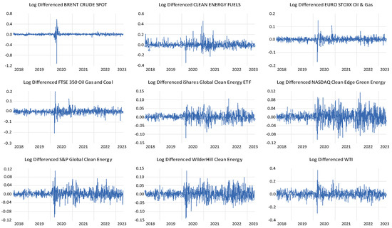 The decision was made to use a series of returns instead of a price series based on an examination of the behavior of the clean and dirty energy markets. According to [29,30], investors tend to prioritize information regarding the profitability of a specific asset or asset portfolio. Furthermore, the series of returns exhibit statistical characteristics that aid in their analysis and comprehension, with emphasis on stationarity, denoting that the mean and variance remain relatively constant over time. The aforementioned characteristic holds significance in the context of implementing econometric models, as it enables investors to acquire more valuable insights pertaining to the conduct of assets that are frequently absent in price series.