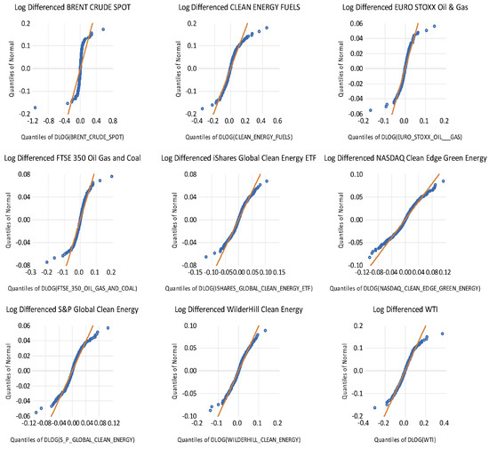 The Q-Q plots chart for the clean and dirty energy stock indexes, namely, Brent Crude Spot, Clean Energy Fuels, Euro Stoxx Oil & Gas, FTSE 350 Oil, Gas & Coal, iShares Global Clean Energy ETF, Nasdaq Clean Edge Green Energy, S&P Global Clear Energy, WilderHill Clean Energy, and WTI, is depicted in Figure 2. The period considered for the analysis spans from 3 May 2018 to 2 May 2023. The findings from the Q-Q plots show that the examined stock indexes’ return distribution is both leptokurtic and asymmetric. This is due to the observed data distribution failing to align accurately with the 45 degree straight line, which represents a normal distribution. In light of the unavailability of precise information regarding the distribution of the time series being examined, it is possible to deduce an approximately normal distribution using the central limit theorem (CLT), given that the data sets were comprised of a sufficiently large number of observations.