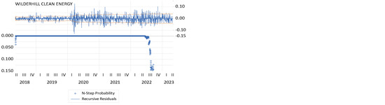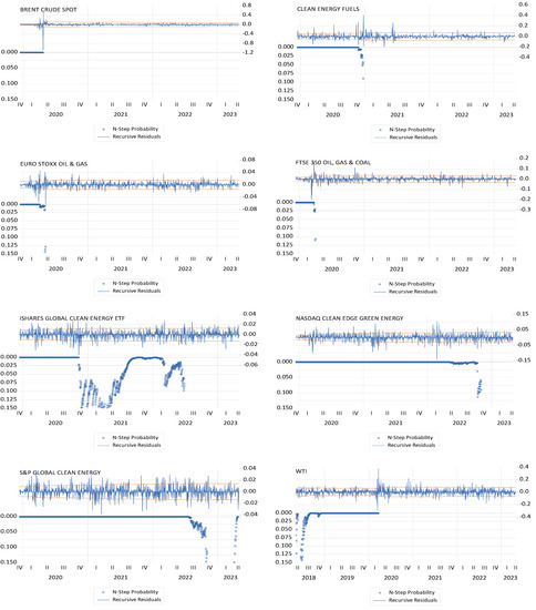 The present study was conducted at different stages. Initially, the sample was characterized through the use of the main measures of descriptive statistics and the [31] adherence test, which assumes the null hypothesis of data normality. In order to verify the stationarity assumption of the data, specifically whether the series follows a white noise process characterized by a mean of 0 and constant variance, we will employ panel unit root tests from [32], with Fisher chi-square transformation, and the [33] test, which posit identical hypotheses (). To validate the results, we will use the [34] test, which proposes an opposing null hypothesis (). The concurrent application of the tests will facilitate a more rigorous evaluation of the time series’ stationarity. The augmented Dickey–Fuller (ADF) test is a commonly employed tool in the evaluation of financial time series. It encompasses multiple variants, including the ADF Fisher chi-square and ADF Choi Z-stat tests. The ADF Fisher chi-square test is a version that employs a test statistic derived from the difference between the estimated and hypothetical coefficient values in the regression model. The ADF Choi Z-stat version uses a distinct methodology whereby the statistical values are obtained from the maximum likelihood estimation of the autoregressive model. Both iterations are used to evaluate the existence or non-existence of a unit root within the time series. Furthermore, the [34] test relies on the estimation of the regression coefficient between differences in series and a set of instrumental variables, which are employed to detect the presence of a deterministic trend in time series. In addition, residue stability tests have been employed to validate the presence of disturbances in variance for both the clean and dirty energy stock indexes. This test enables the identification of significant changes in variance over the sample period while considering the occurrences in 2020 and 2022.