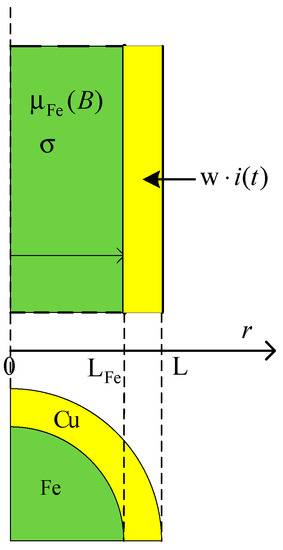 In the discussed example, the system is axisymmetric and infinite in the z-axis. The space-time model applies to a segment with dimensions L = 12 mm LCu = 10 mm and the length of time equal to one period of the supply voltage. The fragment was discretized in the r axis ( points) and the t axis ( points). The equivalent external circuit (supplying the analyzed part of the coil) consists of a sinusoidal voltage u with an amplitude of 1.5 V and a small lumped resistance . The number of turns in this fragment was equal to W = 10. The following material constants for iron were assumed: bulk conductivity S/m, B-H curve Figure 3.
