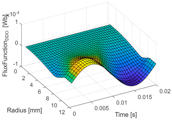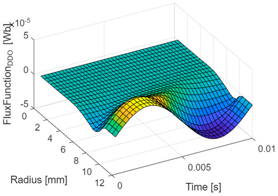 It should be noted that the cross-sections against the radius are nearly sinusoidal in time because the coil is supplied with monoharmonic voltage and the flux function should follow the shape of the voltage.