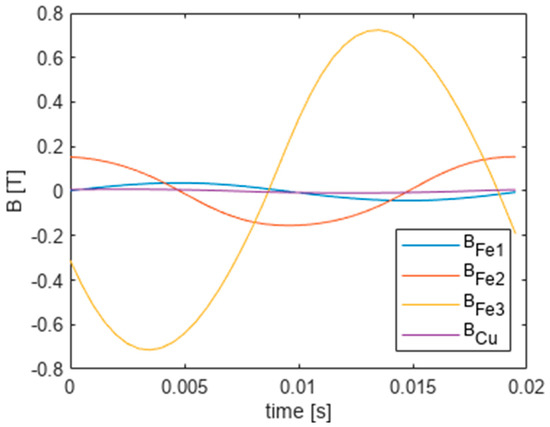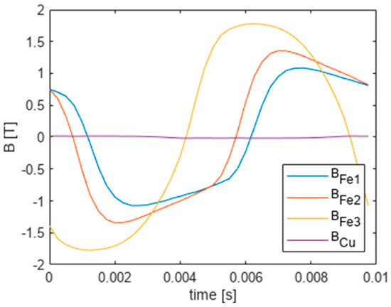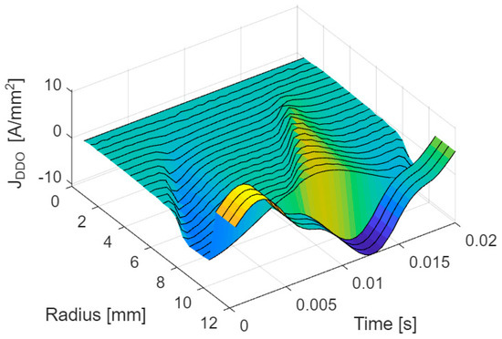 In Figure 10, the current density waveforms were obtained using the DDOs method. It can be observed that the waveforms in the core are in phase opposite to the coil current and are attenuated inside the core, which is a fundamental phenomenon for an alternating magnetic field in a conductive material. The non-linearity of their deformation depends on the radius.