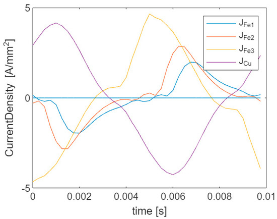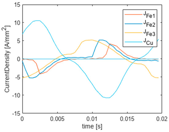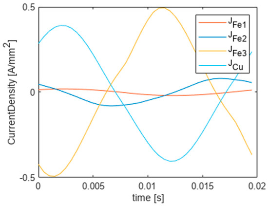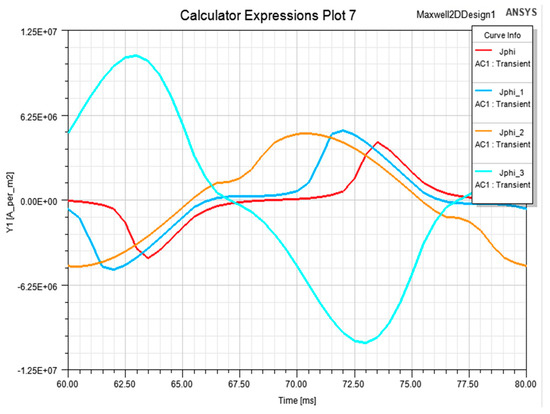 For comparison, Figure 11 shows the waveform of the current density obtained with the Ansys-Maxwell program in the fourth period of the transient state simulation at the same points r (Table 1). The waveforms keep the same character and both are qualitatively and quantitatively identical.