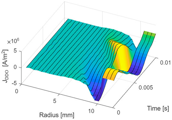 The following figures show the results of the DDOs calculations analogous to those for 50 Hz pulsations. Figure 17 shows the changing current density as a function of time and radius, it shows a clearly smaller penetration depth compared to the case for 50 Hz (see Figure 8).