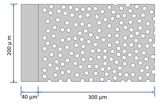 Simulating the entire volume of the microfluidic chip used in the experimental work required high computational power. Therefore, to overcome the problem with computational costs, a section of the model was generated to mimic the entire experimental model. The simulated volume (SV) is presented in Figure 4. The SV is 200 µm wide and 300 µm long, with an extended inlet of 200 µm × 40 µm to establish a fully developed flow at the inlet. The surface area of the SV is m/s, while the surface area of the entire model used in the experiment is m/s. The computed porosity of the SV is 78%, which is approximately 5% more than the porosity of the entire model (74%).