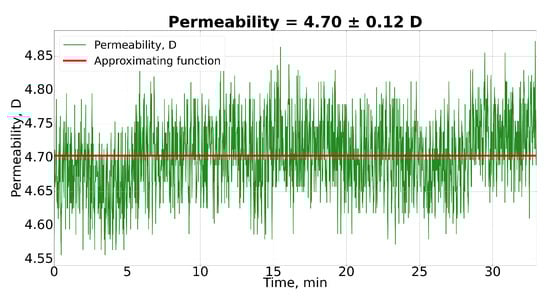 where q—flow rate, ml/min; —dynamic viscosity, Pa·s; l—length of the porous structure, µm; A—cross-section of the porous structure, µm2; —differential pressure, MPa. Figure 5 shows the calculated permeability over time due to the changing differential pressure. The approximating function was plotted to obtain a single permeability value. The uncertainty of permeability was obtained by considering the accuracy and precision of the pressure sensors, pump and thermocouple (S1). The definition of permeability was substantial for preliminary pressure drop estimation and further use in simulators.