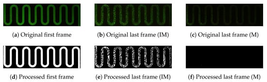 Finally, the algorithm setting produced four frames for each video: two original and two processed frames. Figure 6 shows an example of such processing for miscible and immiscible flows. If the algorithm setting is successful, it can be applied to all videos.