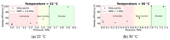Finally, the algorithm combines the final values of the sweep efficiency for each temperature and plots them in graphs (Figure 8). The point at which the displacement coefficient reaches a value close to 100% for the first time is taken as the minimum miscibility pressure value. The quantitative analysis of changes in sweep efficiency for each video gives additional confirmation of the pressure when miscibility occurs. Therefore, for 22 and 30 C, we obtain the MMP values of 5.6 and 7 MPa, respectively, which a literature review can further validate.