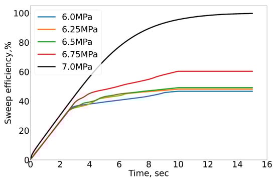 The results from the microfluidic experiment gave insights into the set of equations to implement for the experimental pressure and temperature ranges. Furthermore, for temperature and pressure ranges with indications of near-miscible flow, the same set of equations was used (Equations (1) and (2)). As the fluid approaches miscibility, the interfacial force decreases and the clear interface between the two fluids reduces. This concept was implemented in the numerical model by decreasing the value of IFT for the given fluids for the simulation of the near-miscible region. The interfacial force between the two fluids was adjusted based on the reported literature. In contrast, for the miscible displacement, the value of IFT approaches the minimum and, hence, no clear interface between the two fluids exists; rather, a thick zone of mixing of CO2 and n-decane could be seen [72]. In this simulation, the IFT between the two fluids under the miscible conditions was neglected. Simulations of immiscible, near-miscible and miscible flows were performed at 30 C. Overall, five pressure points were computed, 6.0 MPa, 6.25 MPa, 6.5 MPa, 6.75 MPa and 7.0 MPa, as shown in Figure 9. The sweep coefficients of the various simulations were computed by the fluid volume fraction at every time step. From the simulated models, the simulation at 7 MPa attained a 100% sweep coefficient, while the sweep coefficients of the simulations at 6.75 MPa, 6.5 MPa, 6.25 MPa and 6.0 MPa were 60.35%, 49.17%, 48.18% and 46.74%, respectively, as shown in Figure 9. A video representation of the simulated models is included in the Supplementary Information (Movies S3–S7).