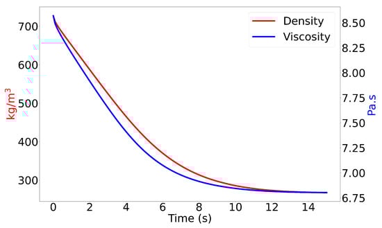 where c—concentration, mol/m; D—diffusivity coefficient, m/s; v—velocity, m/s; R—source term of the concentration of a species, mol/m. Under the miscible conditions, the interfacial force between the two fluids approaches zero; hence, it disappears. The fluid–fluid interface is controlled by the rate at which the injected fluid diffuses into the displaced fluid. Therefore, the mixing of the fluids changes the rheology (density and viscosity) of the resultant fluid mixture. Furthermore, the consequent mixed fluid swells and increases in mobility compared to the original displaced fluid. However, in this work, the set of equations used assumes the incompressibility of the two fluids and the resultant mixture. Hence, the effect of fluid swelling is neglected. In contrast, the potential changes in the chemical composition of the resultant fluid mixture are described by the continuous averaging of the fluid mixture in the domain at every computational time step. The resultant fluid density and viscosity are calculated by Equations (4) and (5), respectively [68].