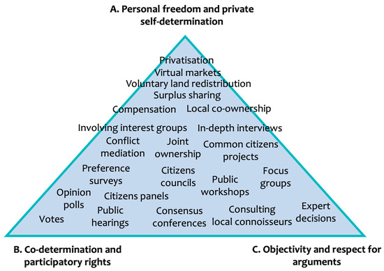 Three basic sets of values related to democracy and institutional setups. The variety of models for decision-making (or decision-influencing) is distributed in the figure in accordance with each model’s position in relation to the three sets of values (based on [19]). The various methods and procedures will be explained in the text in relation to cases of RE facility implementation.