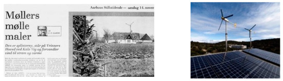 The early Danish wind turbines were small and could easily be placed on a single person’s property without much disturbance to the neighbors. The turbine to the left is the first commercial turbine, established in 1979 at Torgny Møller’s property in the village Vrinners (article clip from a local newspaper, Aarhus Stiftstidende). Today small turbines—and solar PV facilities—are still produced (right), but they do not account for much of the total energy balance.