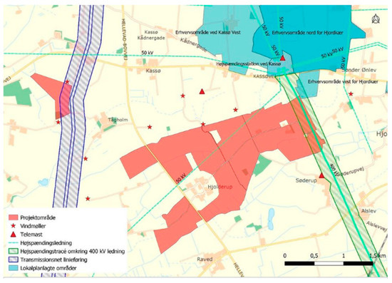 The village Hjolderup is surrounded by the solar PV plant (red), which again is partially surrounded by wind turbines (red stars) [46].