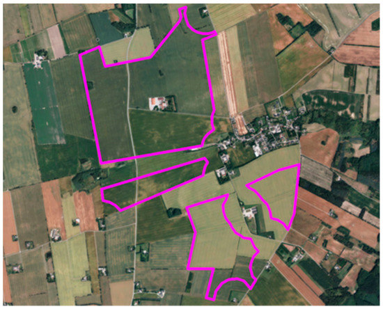 An example of a temporary organization is the association of 265 neighbors because of an upcoming solar plant in Ålsrode on Djursland in eastern Jutland: “Solcellepark Kejsegården—NO THANKS” [83,84,85]. A farmer and the remote developer European Energy collaborated in an application to the municipality Norddjurs to develop a large PV plant covering 240 ha and producing electricity for the consumption of more than 300,000 people. The plant was planned to be placed on the fields surrounding the village Ålsrode (Figure 6), which is located in a valued old manor landscape with dykes, living fences, and moraine hills.