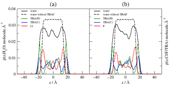 This study is an extension of our previous research on the interfacial properties of TBAB (aq), with and without the presence of CH4 and CO2 [30]. In this study, to determine the effect of the anion size and charge density of the tetrabutylammonium halides on the interfacial properties of gas/water systems, aqueous solutions of TBAC and TBAF were simulated, and their results were compared to those of the TBAB systems in our previous work [30]. The z-density profiles for the water molecules and ions in the pure TBAC (aq) and TBAF (aq) at 273.15 K, as well as that for a pure water phase at the same temperature, are shown in Figure 2. The z density for the water across the slab in the TBAX solution is non-uniform, with a higher density near the solution–vacuum interface, as opposed to the interface of the pure water. In addition, the TBA+ (atoms N and C) and anions are inhomogeneously distributed in the aqueous phase along the z direction, such that the TBA+ ions have the highest density at the interface, and the anions are close to the maximum density of the water molecules at the interface and the bulk of the solution.
