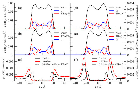 Figure 3 shows the z-density profiles of water, CH4, CO2, Cl−, and TBA+ in the water-TBAC/gas system at 298.15 K and at two different pressures. As shown, the z-density profiles of the water molecules are not so sensitive to the pressure and anion type, while the TBA+ cations’ z density at the interface with non-polar CH4 gas is slightly increased when compared to that of the solution exposed to CO2. It is obvious that, at approximately the same gas pressure, the gas molecules’ density at the interface in the TBAC solutions is higher than that in the pure water system; it also increases with an increasing gas pressure at the solution interface. Moreover, the surface density of the CO2 is enhanced to a greater absolute degree compared to that of CH4 at a similar pressure, because the CO2 molecules show stronger intermolecular interactions with the water molecules at the interface.