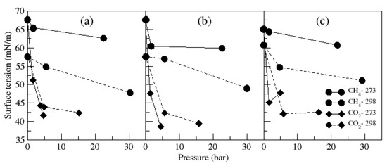 - Massoudi, R.; King, A.D., Jr. Effect of pressure on the surface tension of aqueous solutions. Adsorption of hydrocarbon gases, carbon dioxide, and nitrous oxide on aqueous solutions of sodium chloride and tetrabutylammonium bromide at 25.deg. J. Phys. Chem. 1975, 79, 1670–1675. [Google Scholar] [CrossRef]