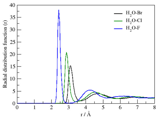 Figure 6 shows the halide–water radial distribution functions (RDF) in the TBAX aqueous solutions. Distinct peaks at around 2.4–3.2 Å are observed for the X-water RDFs, with the relative heights implying that the F− ions had the strongest interactions with the water molecules in the solution and at the interface. It was previously found that the lifetimes of chloride and bromide ion–water hydrogen bonds are shorter than those of fluoride ion–water hydrogen bonds, but longer than those of water–water hydrogen bonds. In addition, the hydration shell of fluoride is much more rigid than that of other ions, implying it may be more stable [36].