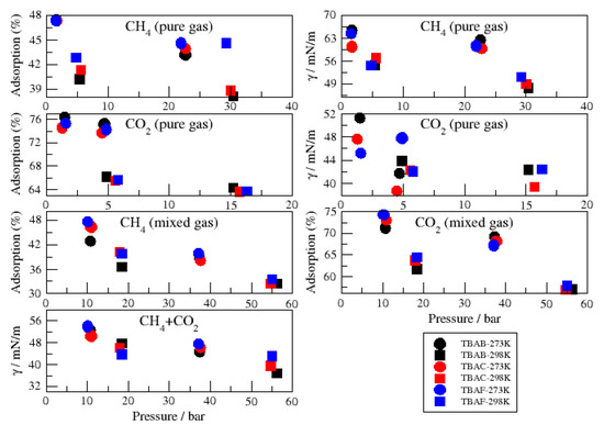Figure 7 represents a general comparison of the three TBAX (X: Br, Cl, F) solutions for the adsorption percent of gas molecules and surface tension at the gas/liquid interface. In the presence of the gas mixture, TBAF often increased gas adsorption and TBAB had the lowest adsorption value. The effect of the anion type of TBAX on the surface tension is not clear; nevertheless, it was found that TBAF often causes a greater decrease in surface tension at low pressures, while further surface tension decreases were observed in the presence of TBAB and TBAC for both pure and mixed gas systems at high pressures. However, while the anions are primarily positioned inside the surface of the TBAX aqueous solution and interact less strongly with the gases at the solution surface, they can still affect the interfacial properties of TBAX aqueous solutions, and consequently gas capturing into the hydrate cavities.