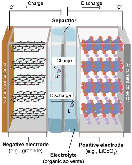 A lithium-ion battery’s operation is shown schematically [20]. The negative electrode is composed of a low-potential material, such as graphite, whereas the positive electrode is composed of a transition metal that can release and receive lithium ions in its lattice. The electrolyte can be a liquid with a high ion conductivity and a wide potential window that is created by dissolving a lithium salt in an organic solvent.