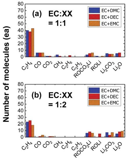 The SEI components revealed for the mixture electrolytes of: (a) EC/XX (XX = DMC, DEC, and EMC) = 1:1 and (b) EC/XX (XX = DMC, DEC, and EMC) = 1:2. They are gases (, , , , , and ); inorganic ( and ); and organic components ( and : R = or ). This image is reprinted with permission from Yun et al. [41] (Copyright 2023 American Chemical Society).