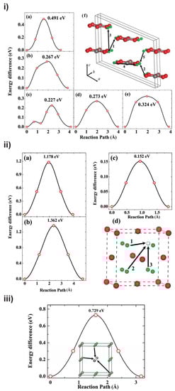 Iddir et al. [74] conducted one of the first theoretical studies on lithium-ion diffusion in an inorganic SEI component using density functional theory (DFT) [75] calculations in 2010. They focused on the possible diffusion paths of the lithium ion within a lithium carbonate () crystal, as this component is thought to be one of the most stable SEI components on the electrode surface [76]. First, they investigated the equilibrium position of an interstitial Li ion in the crystal and then obtained the overall migration energy profile by applying the NEB [77] method to different diffusion paths. They were able to conclude from the results that the diffusion of the interstitial Li ion in is almost two-dimensional, with migration favored along the [0 1 0] direction. Furthermore, the migration barrier calculated for Li-ion diffusion along the favored direction is about 0.28 eV, which is similar to the migration barrier calculated for lithium-ion diffusion in graphite (i.e., 0.3 eV under the lithium excess [78]). As a result, they were able to demonstrate that a thin layer of on the graphite anode with the proper orientation can ensure good ionic conductivity without slowing down the transport of lithium ion in the graphite, while also improving electrolyte thermodynamics stability at the interface. Iddir et al. [74] focused on interstitial diffusion but, as Chen et al. [79] pointed out, Li ions also diffuse due to the presence of vacancies in the SEI crystal components. Hence, Chen et al. [79] used DFT to continue the investigation of Li-ion diffusion, this time attempting to shed light on the effect of vacancies in the crystal structures. Specifically, they investigated the diffusion of lithium ion into the main components of the inorganic SEI, namely the bulk of , lithium oxide (), and lithium fluoride (), by removing one lithium atom from the ideal supercell. Their findings demonstrated that the diffusion of is accelerated by the existence of vacancies. In particular, their results showed a slight decrease in the energy barrier for diffusion along the [0 1 0] plane in , thus reducing the previous value of approximately 0.28 eV for interstitial diffusion [74] to the values of 0.227 eV and 0.273 eV (see Figure 4i energy profiles (c) and (d)). Moreover, for lithium-ion diffusion along the [0 1 0] plane, a substantial decrease in the energy barrier was observed, ranging from the previously reported value of about 0.60 eV for interstitial diffusion [74] to the values of 0.491 eV, 0.267 eV, and 0.324 eV (see Figure 4i energy profiles (a), (b) and (e)). The energy barriers that Li ions must overcome to diffuse in (see Figure 4i) and (see Figure 4ii) are comparable to or slightly lower than those for Li ion diffusion in graphite, ranging from 0.308 to 0.400 eV [80], although they are greater in (see Figure 4iii). As a consequence, a higher energy barrier for Li-ion diffusion in SEI than in graphite may be attributed to a higher concentration of in the passivation layer.