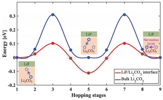 Several environmental parameters, such as the applied electric field and temperature, have an impact on the transport of lithium ion in SEI as well. To evaluate these effects, various modeling approaches are frequently combined. The ab initio molecular dynamics (AIMD) [83] method is one way to research atomic-level diffusion mechanisms. Atomic interactions are derived from quantum mechanical calculations in this method, and then the atoms are allowed to propagate through the system according to the laws of classical mechanics. AIMD simulations can include systems of a few hundred atoms as well as short-lived phenomena lasting between 10 and 200 ps. For example, Ahmad et al. [48] used AIMD simulations to investigate the conduction of lithium ions at the interface of and as the temperature changed. Specifically, they studied the effects of this interface on Li-ion diffusion in . They compared their findings to those obtained for lithium-ion diffusion in the bulk and discovered a significant reduction in the activation barrier from 0.3 eV to 0.1 or 0.22 eV due to the interface (see Figure 5). Their work highlighted the importance of interfaces in the analysis of SEI properties.