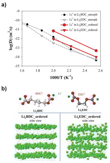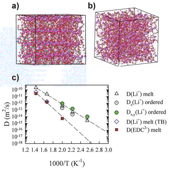Later, Bedrov et al. [60] performed MD simulations to further investigate on the mechanism of lithium-ion diffusion in the amorphous and ordered states of organic SEI alkyl-carbonate compounds by using the same polarizable force field. They focused on analyzing how the properties of and changed with temperature. The diffusion coefficients of and were found to be similar at high temperatures, but as the temperature dropped, they discovered significant differences. For example, at 500 K the diffusion coefficient of was approximately 20 times smaller than that of . This comparison of the ordered and disordered states revealed that the Li-ion diffusion in the ordered state is larger (see Figure 7a). The temperature range of ordered systems was 393–500 K, and the motion of appeared to be primarily confined in 2D diffusion within the layers of the organic SEI components because they are close enough to allow occasional transfers of , as shown in Figure 7b. Slow SEI growth would give enough time to form ordered structures, resulting in higher ionic conductivity. In contrast, despite its higher ionic conductivity, the presence of in the SEI should be limited to optimize battery operation because they have a lower shear modulus (1.4 GPa compared to 2.8 GPa for at 393 K) and reduce the SEI’s ability to prevent dendrite growth.