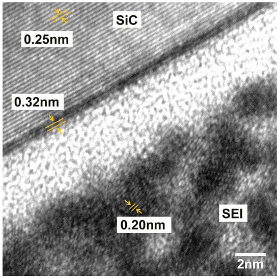 A representative ex situ HRTEM image of SEI at the graphene-coated SiC surface after 14 mA h cm−2 lithiation is shown. In the chosen orientation, the image reveals the crystal lattice structure of SiC (0001) with a layer spacing of 0.25 nm and 0.32 nm graphene spacing between the SiC and the SEI. Moreover, an area of roughly 3 nm thickness apparently amorphous between the graphene and LiF crystals is visible. crystals, distant 0.20 nm, are randomly dispersed in additional seemingly amorphous regions. Reprinted with permission from Chattopadhyay, et al. [49] (Copyright 2023 American Chemical Society).
