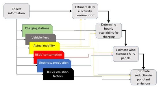 - Collect available information on charging stations, vehicle fleet, actual mobility, certified electricity consumption of BEVs, electricity generation, and pollutant emissions of ICEVs according to vehicle age.