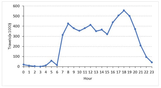 Figure 3 shows the hourly distribution of private transport mobility during a weekday in PB. It follows a pattern of occupational mobility (work and/or study), as the largest number of trips was concentrated between 7 and 9 a.m. and 5 and 7 p.m., coinciding with the departure and return home.