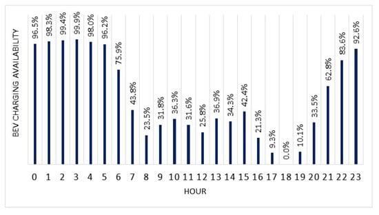 As shown in Figure 4, there is virtually 100% hourly availability for BEV charging between 0 and 6 a.m. Therefore, the additional wind power to be installed for only BEV charging in PB can be estimated by applying Equation (2) with f = 0.7, EC = 9893 MWh, L = 0.232, and tc = 6 h. The result is PA = 4976 MW, or about 5 GW.