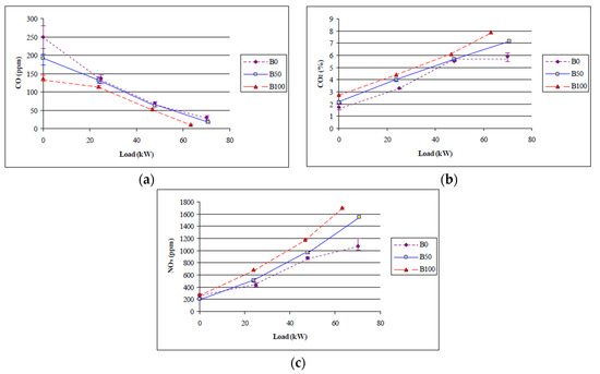 As shown in Figure 2b, CO2 emissions increased with load and with biodiesel fractions. On average, a 20% increase was observed for B50, and a 30% increase for B100 when compared with B0. This is likely due to both the oxidation of the carbon chain and the decarboxylation of the methyl esters [21]. In addition, the fuel bound oxygen content in biodiesel can also reduce incomplete combustion in localized fuel-rich regions [22,23]. The CO2 increase with engine load is likely due to higher temperatures and higher fuel usage at higher loads [24].