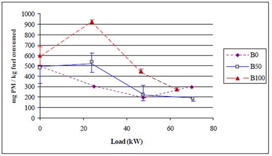 Figure 3 illustrates BPM emission rates (mg PM/kg fuel consumed) for B0, B50, and B100 over different loads. At 0 and 75 kW loads, emission rates from B50 were the lowest by 6 and 50% compared with B0, with an increase of 50% at the 25 kW load. In contrast, B100 produced much higher emission rates than B0 did. A spike occurring at the 25 kW load was observed in both B50 and B100. This suggests that the use of biodiesel blends may be more beneficial to the environment than using 100% biodiesel for engines built in the early 1990s. This is consistent with Guarieiro et al. (2014) [29], who found that emissions are reduced more from B25 and B50 rather than B100.