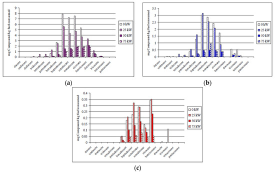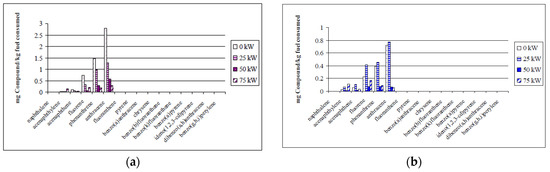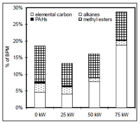The organic composition of particulate matter analyzed included methyl esters, n-alkanes, and PAHs. For most compounds, the highest emissions occurred at 25 kW, which is also in agreement with Figure 3.
