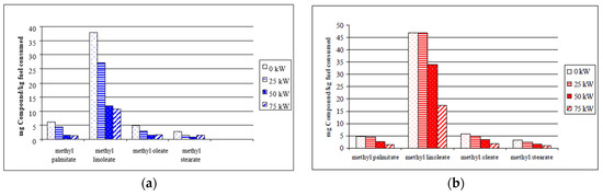 This finding is consistent with functional group analysis via FTIR and TG-MS analysis of m/z ratios [17,18]. However, the significant enrichment of C18:2 methyl esters (approximately 71% in BPM as opposed to 52% in biodiesel fuel), together with much lower C18:1, are not well understood. One possibility may be that C18:2 has a lower boiling point (192 °C) than C18:1 (218 °C).