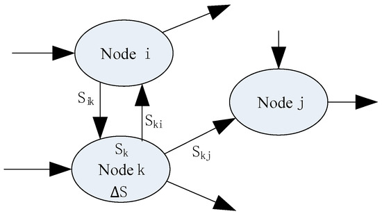 In Figure 1, there are three nodes, namely , , and , with the node being the analytical object. Let the number of branches flowing electric energy into the node be and its outflow branches be . Let the total inflow electric energy of the node k be ; stands for the electric energy flowing from the node to the node ; represents the electric energy flowing from the node to the node ; means the electric energy consumed internally in the node . The QIO model for the node is: