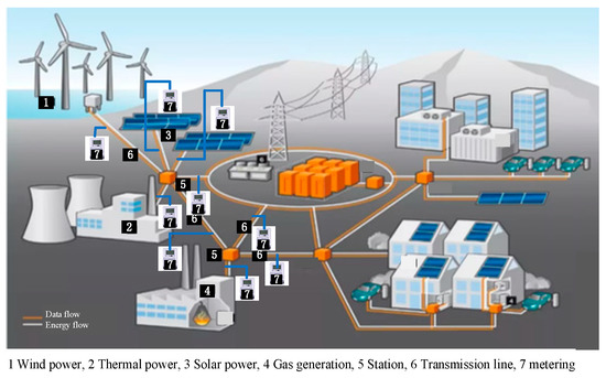 In the power system, the electric energy produced by power plants flows from the transmission lines into the substations at all levels of the distribution network and then onto the user side. Figure 2 shows a simple power network that includes the basic links such as the power plants for multiple forms of energy, the transmission lines, the substations, and the distribution networks. In each link, metering devices are provided for electric energy measurement or monitoring.