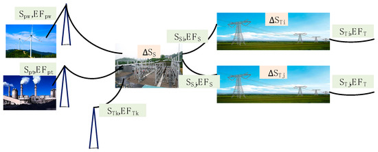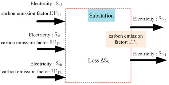In addition to voltage transformation, substations are also important hubs for grid interconnection, interconnecting different transmission lines, and completing energy exchange and trade. Taking the substation nodes as the accounting boundary is a comprehensive carbon emission accounting model when there are multiple sources of inflow electricity and branches of outflow electricity, as shown in Figure 4.