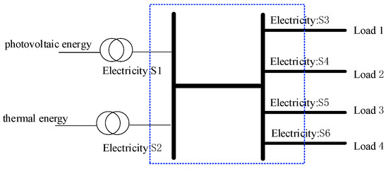 Taking a 110 kV substation in Figure 5 as a carbon emission accounting case, inflow electricity includes a photovoltaic power station and a fossil-fuel power station, and outflows to four different loads. Taking the substation as a carbon emission accounting node, the inflow energy from the photovoltaic power station is S1, the inflow energy from the fossil-fuel power station is S2, and the outflow electricity to the four loads is S3, S4, S5, and S6, respectively.