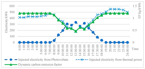 As seen in Figure 6, during the period from 18:00 to 8:00, there was no inflow of electricity from the photovoltaic power plant, and all the loads were powered by thermal power. The carbon EF remained unchanged and was equal to that of thermal power. During the period from 8:00 to 18:00, as photovoltaic power stations began to generate electricity, the injected photovoltaic electricity increased. This reduced the demand for thermal power generation, resulting in a decrease in EFs. The carbon EFs were constantly changing over time due to the inflow of photovoltaic electricity.